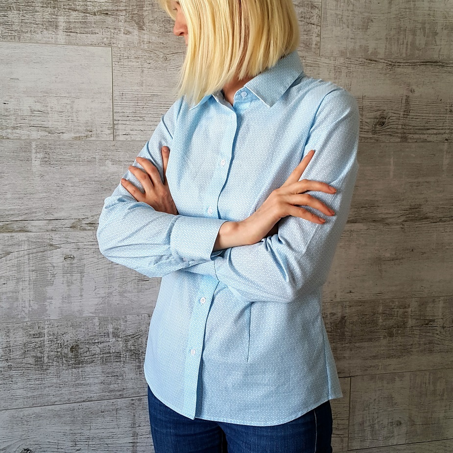 Класична сорочка напівприталеного силуету, виконана з високоякісної італійської тканини. Сорочка має високі манжети на три гудзики, кокетку на спині та комір на стійці.